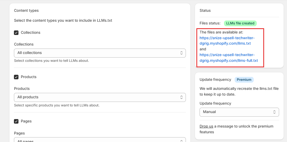 - llms.txt contains names and URL addresses (of products, collections, pages, and blog posts)