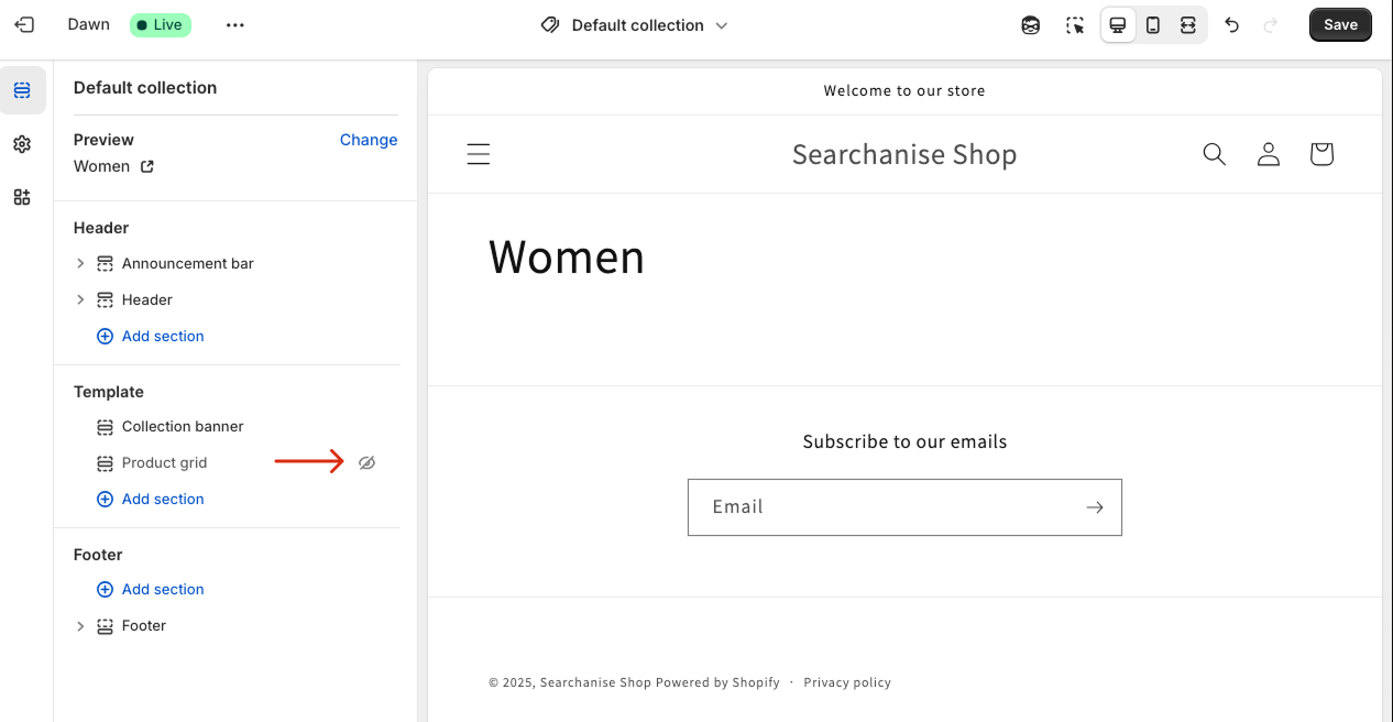 - Replace the Shopify code that shows collections with the Searchanise code from the created snippet. See the instructions here.