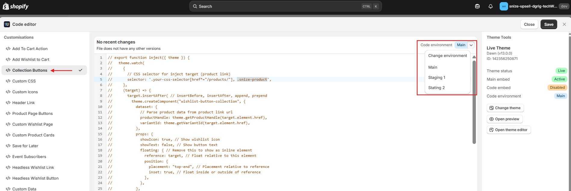 - Go to the Collection buttons section. Make sure the environment in the top-right corner is selected correctly.