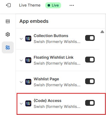In the Theme Editor, check if the {Code} access app embed is enabled. It activates the custom code for the Swish app: