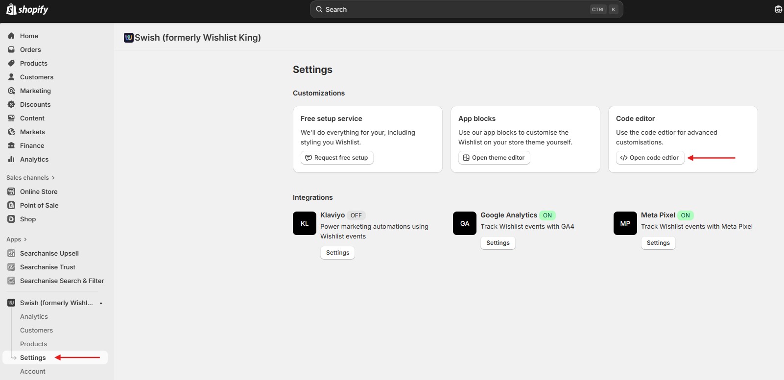 - Go to the Swish control panel > Settings > Open code editor button.
