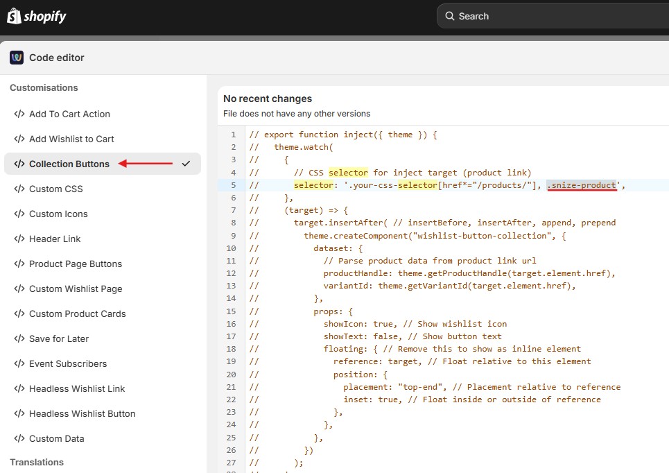 - Add the .snize-product CSS selector to the selector’s code, separated by a comma — for example:
